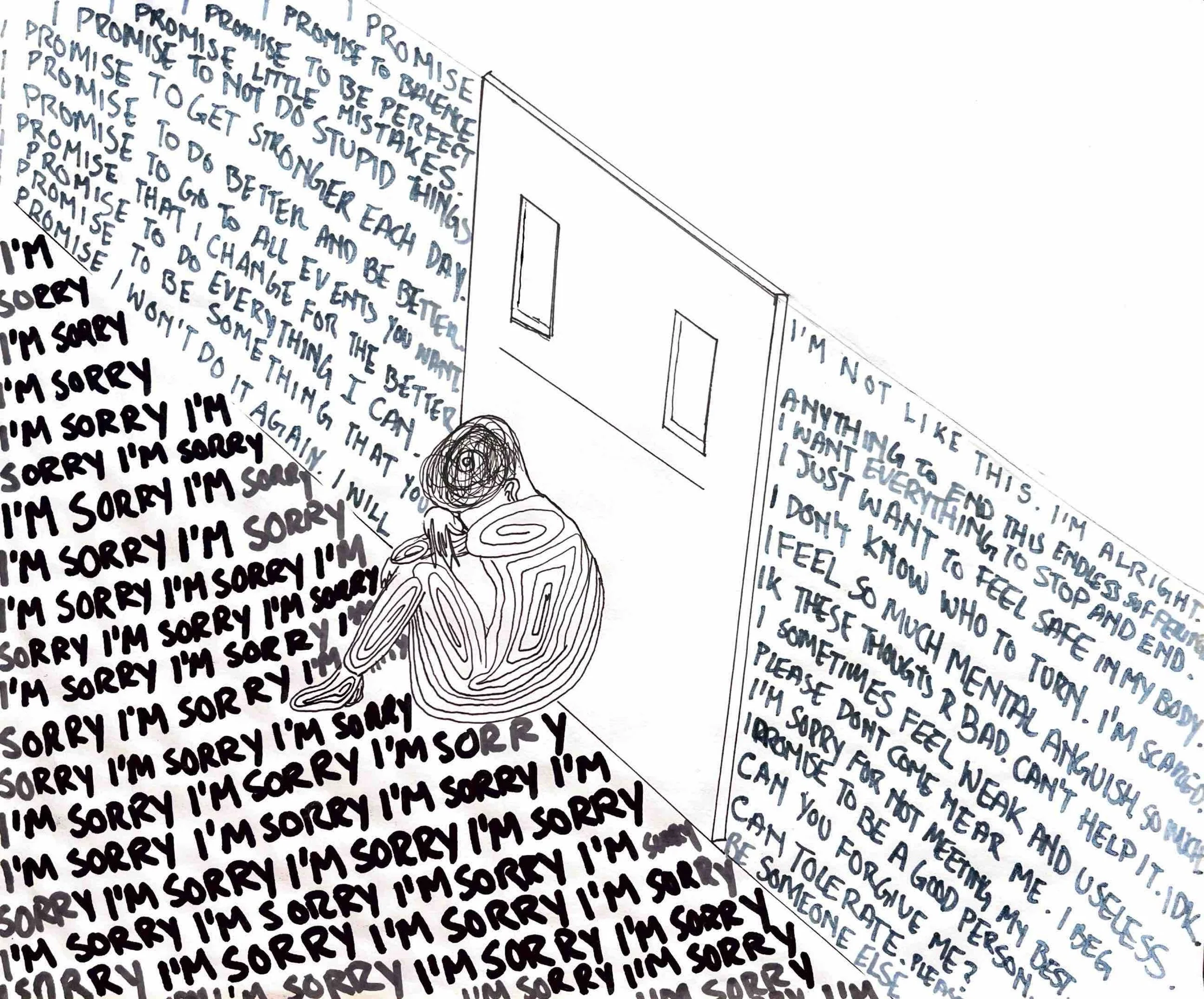 When we experience mental health illnesses/conditions like Bipolar, Schizophrenia, depression and C-PTSD (Complex Post-Traumatic Stress Disorder), it can feel like it’s only you in that boat going through a rocky storm, away from help. This is especially true if you grow up in an asian household that encourages you to suppress your own emotions. When drawing this, I wanted to capture the internal experience of what a traumatic episode looks like to me. It’s a simple recipe of paper, sharpie, muji highlighter and a pen drawn on a clear late winter night, communicating a blatant message about dealing with our inner distress. The walls that we mask in front of people as our intrusive thoughts from our past rains in the sea of our messy emotions that’s in our heads. C-PTSD is experienced bodily or somatically. Sitting while hugging your knees is a vulnerable position that can communicate grief and sadness.